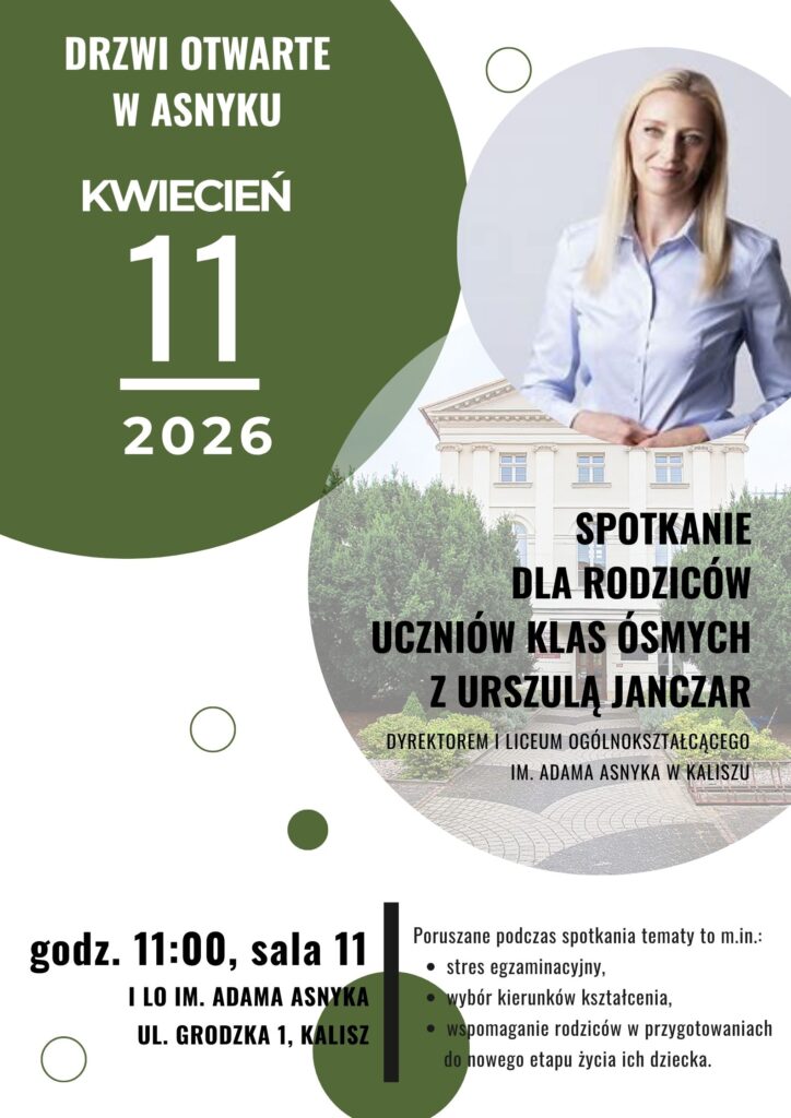 Zapraszamy na spotkanie z Panią Dyrektor I Liceum Ogólnokształcącego im. Adama Asnyka w Kaliszu. Spotkanie odbędzie się podczas Drzwi Otwartych w szkole przy ul. Grodzkiej 1 w sali 11 o godz. 11:00. Rodzice będą mogli zapoznać się z ofertą szkoły oraz szczegółami dotyczącymi rekrutacji. Zapraszamy serdecznie!